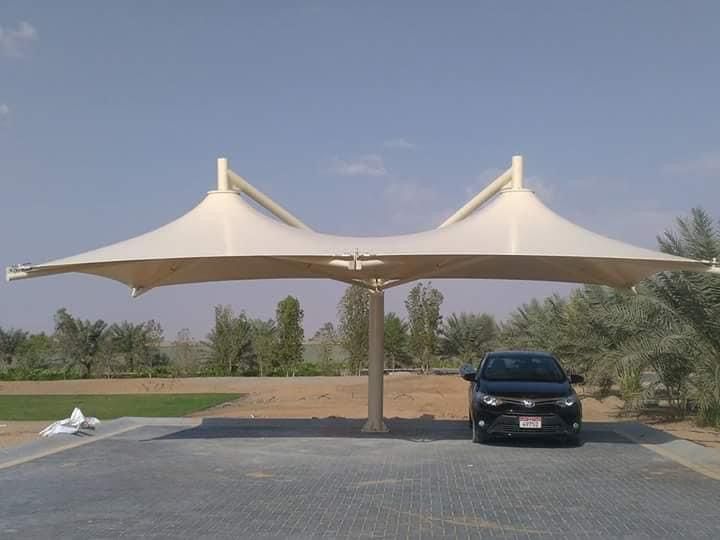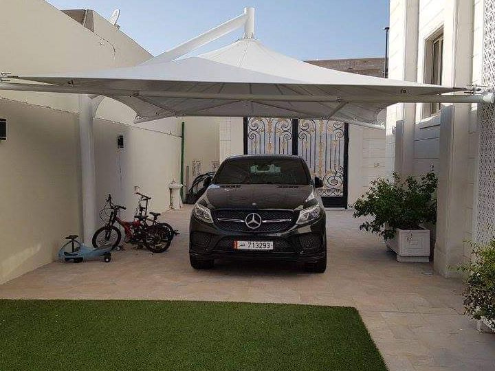 هذا النوع من المظلات هو الافضل لمواقف السيارات والنوادي ومناطق حمامات السباحة والمدارس ودور الحضانة وغيرها من الاماكن التي يجب أن تظل فيها المنطقة المظللة خالية بدون أعمدة حيث نستخدم أعمدة للدعم في جانب واحد فقط وبدون أي اعمده في الجانب الأمامي.